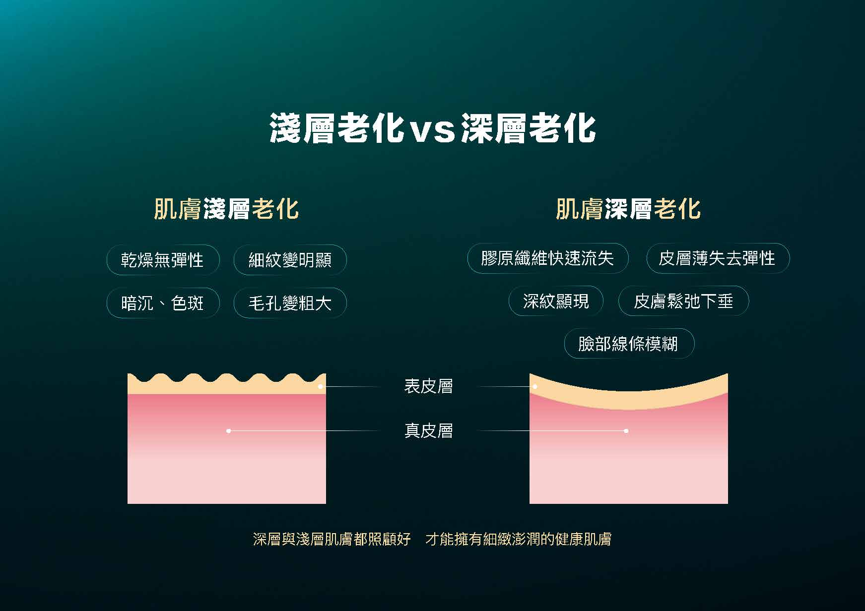 肌膚老化分為淺層老化及深層老化,淺層與深層都照顧好,才能擁有細緻澎潤的健康肌膚。