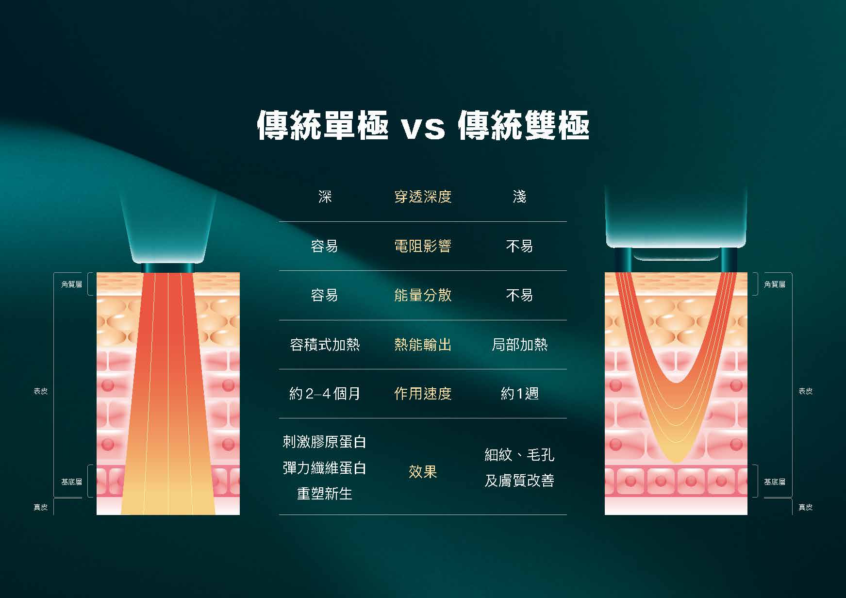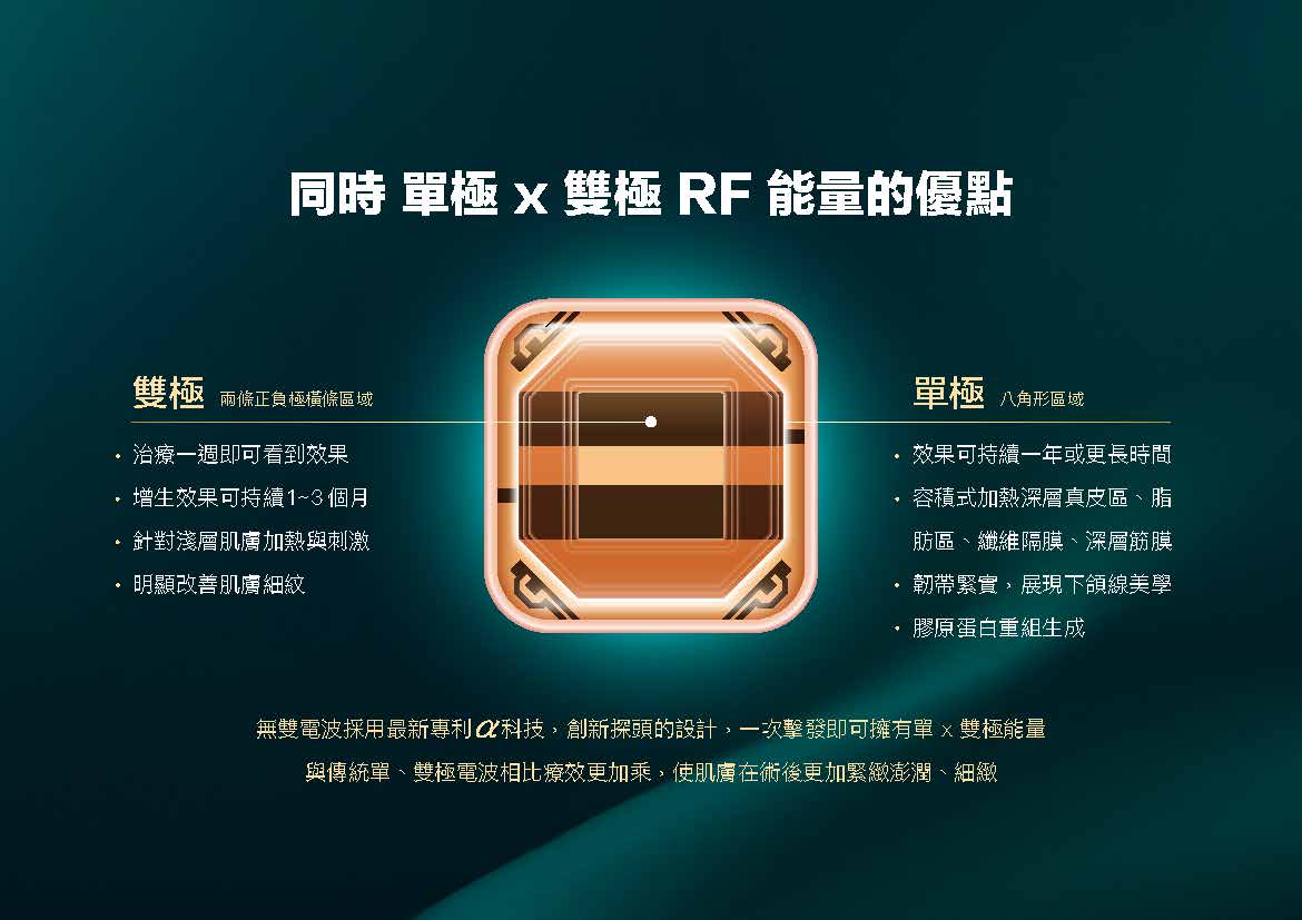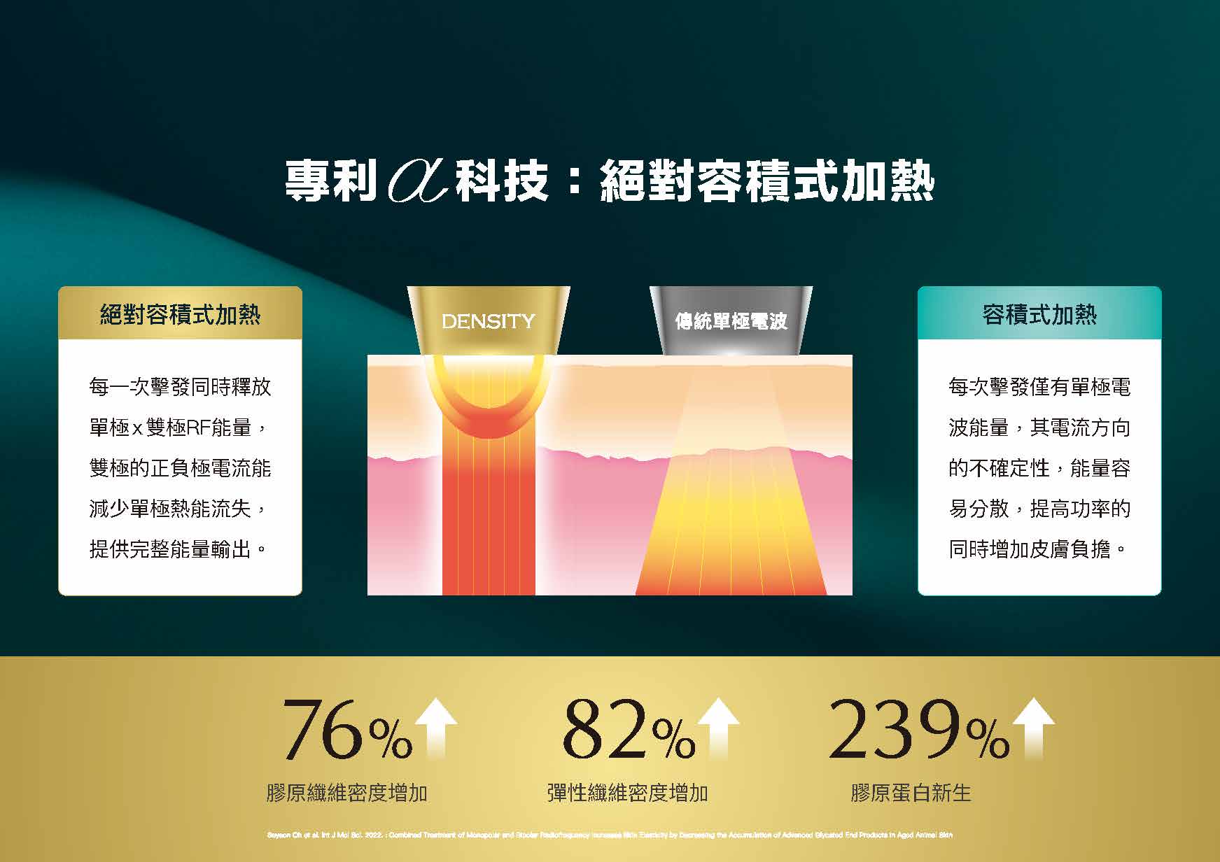 Density 無雙電波採用專利 α 科技,單次擊發同時提供單極與雙極能量,針對真皮淺層(乳突層、網狀層)及深層加熱,