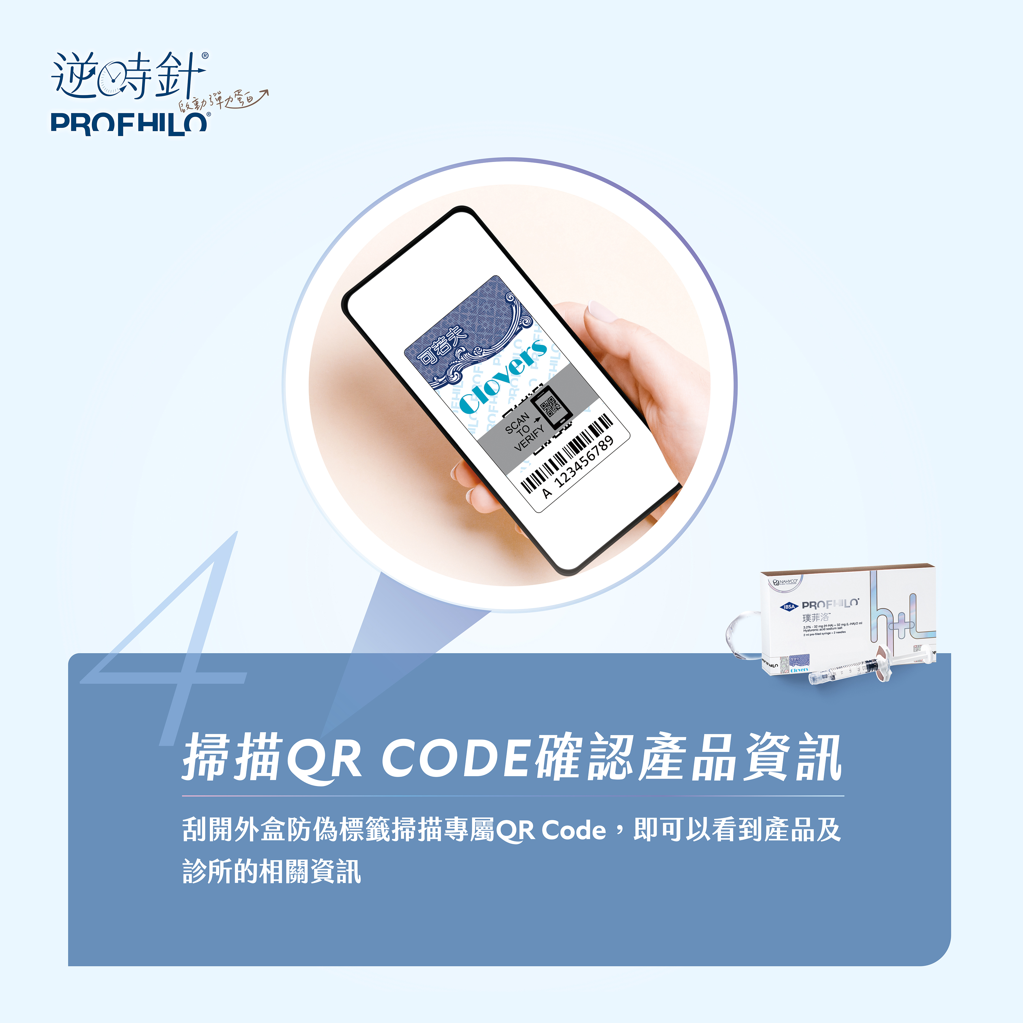 確認產品資訊刮開外盒防偽標籤掃描專屬 QR Code,即可以看到產品及診所的相關資訊。